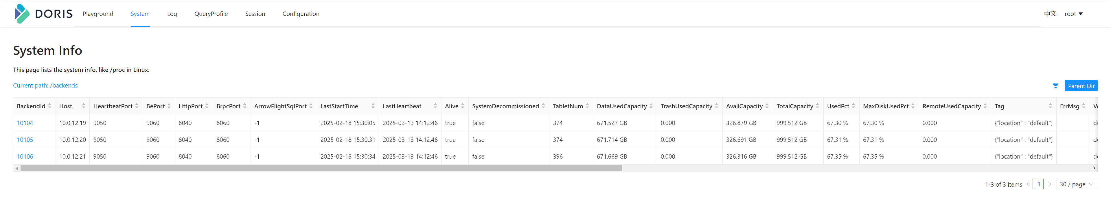 已部署三个FE、BE节点并且状态显示正常运行中