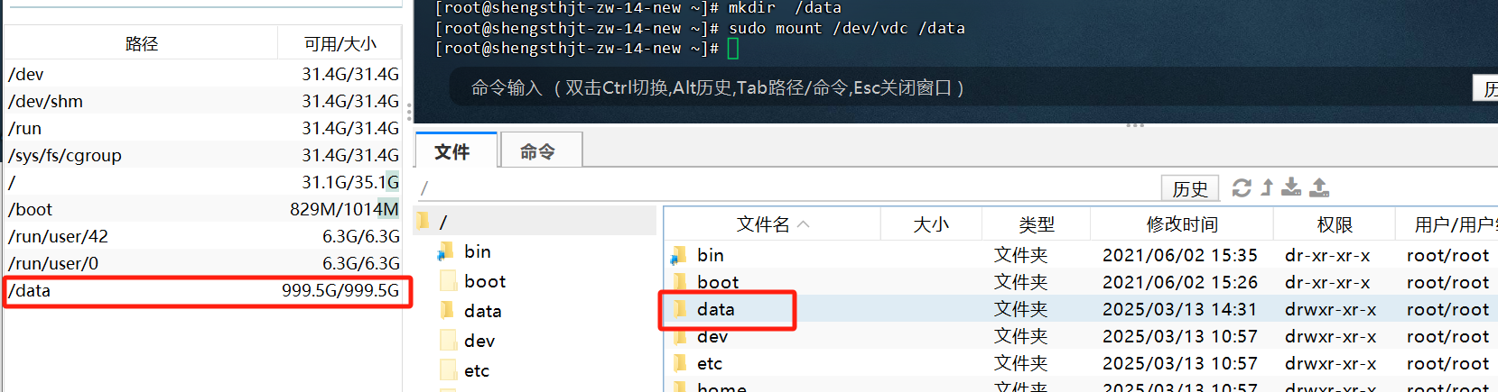 此时磁盘已经应用到data文件夹,但此时只是临时性的,还需设置开机自动挂载,即可永久挂载。