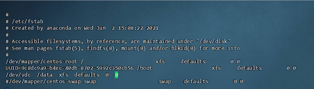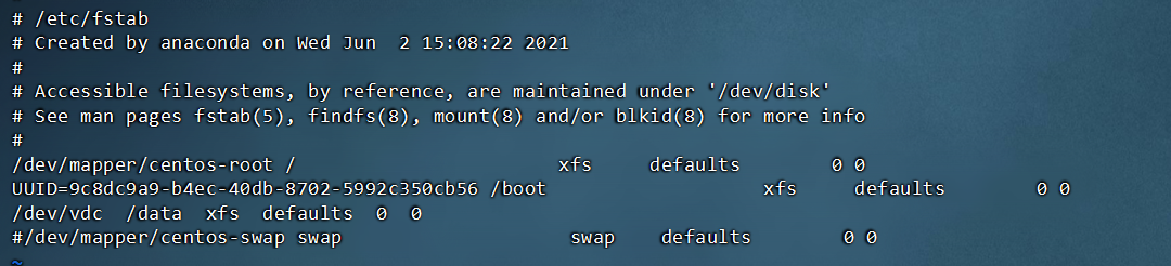 /dev/vdc /data xfs defaults 0 0