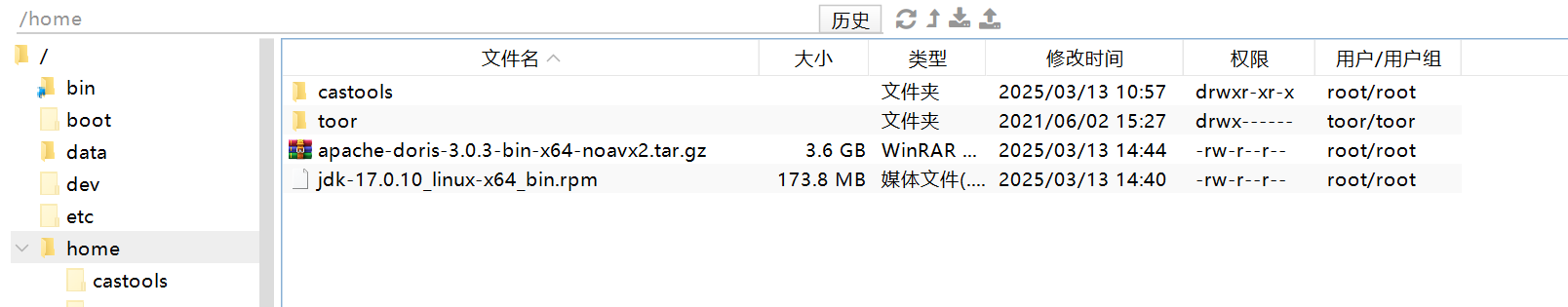 我这里是上传到系统盘的/home路径下,将程序自身位置与数据存储分磁盘存储,会有利于FE、BE节点的运行效率。
