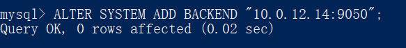 ALTER SYSTEM ADD BACKEND "10.0.12.14:9050";