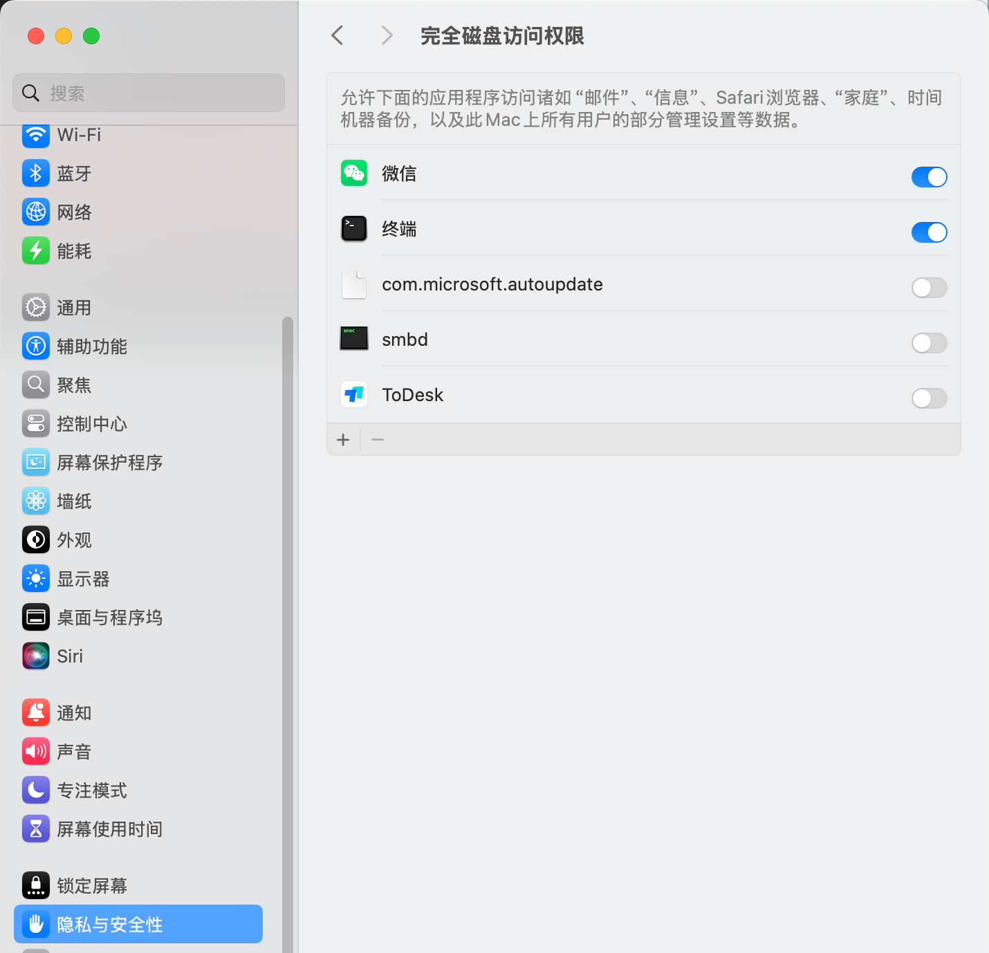 sudo codesign --sign - --force --deep /Applications/WeChat.app如果执行命令失败,权限不够,需要在设置-在隐私与安全性-完全磁盘访问权限,分别增加微信以及终端,直接输入名字选择打开就可以.