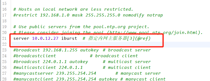 server 10.0.12.27 iburst  # 指定内网主服务器
