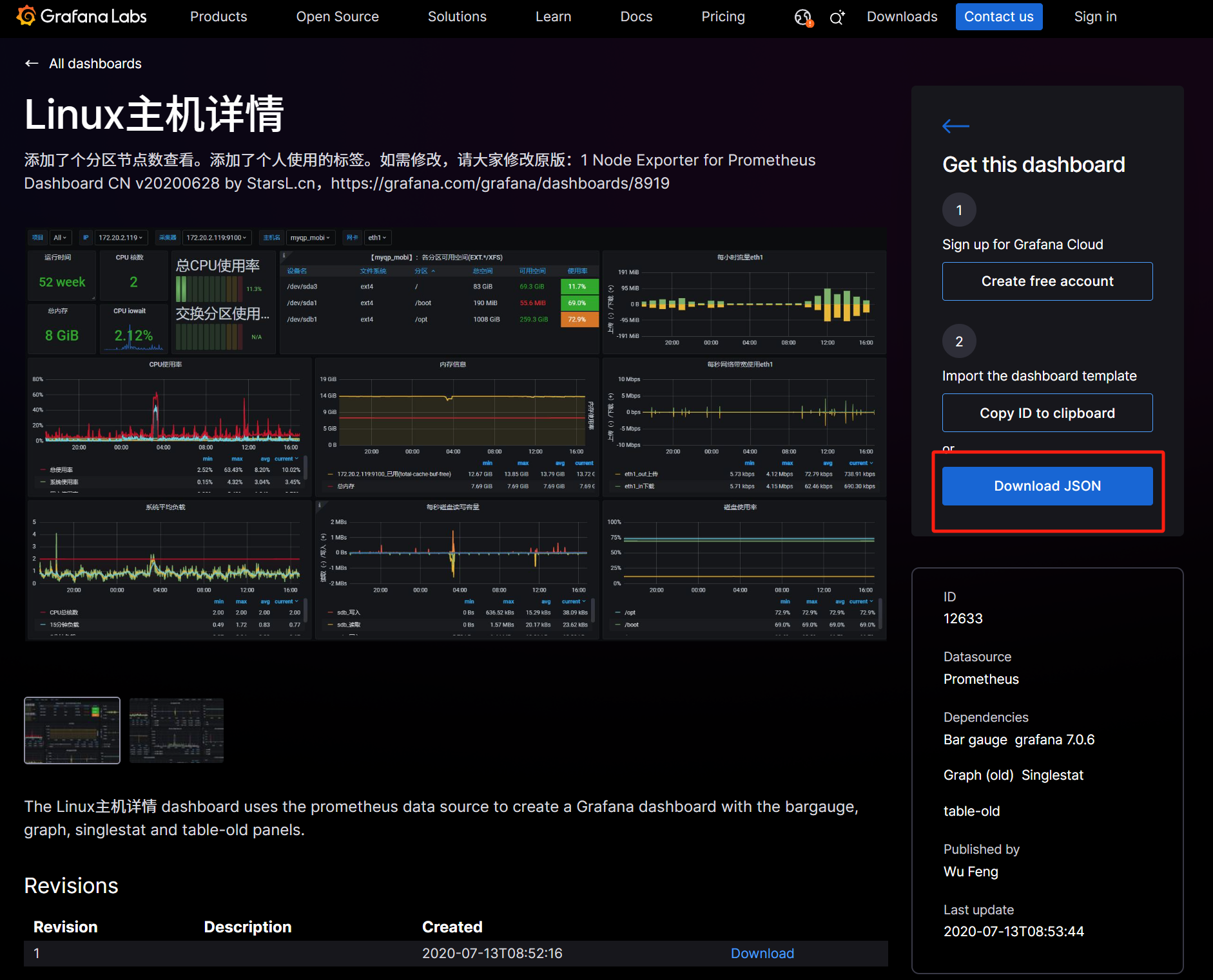 点击“Linux主机详情”模板,进入到"Linux主机详情“,点击"Download JSON"