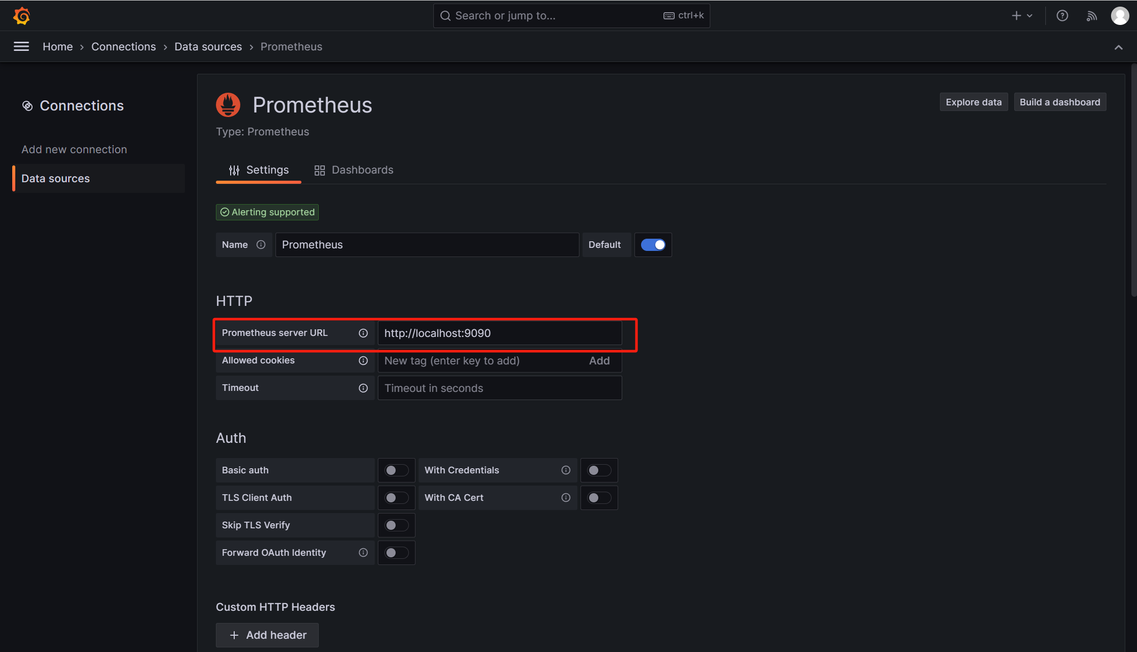 在弹出的Prometheus页面的表单中的HTTP区域的 Prometheus server URL 输入Prometheus的登陆链接http://localhost:9090 或者将localhost 更换为本机的IP地址