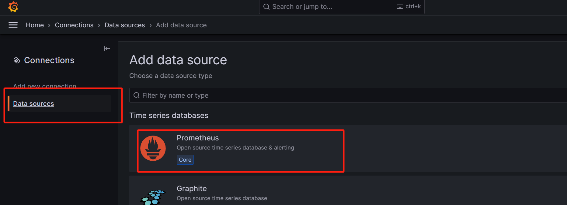 在弹出的Add data source页面上选择第一个Prometheus